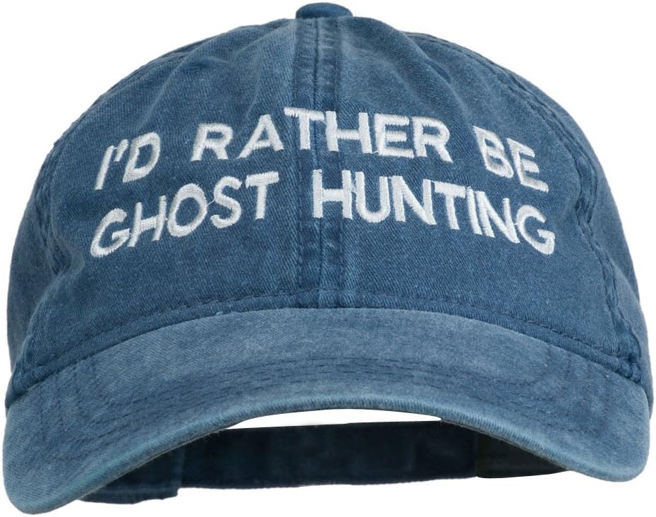 Product Title, Rather Be Ghost Embroidered CapMaterial, Made of 100% cottonSize Info, One size fits most, adjustable buckle closure, fits up to XLInner Band, Same material inner hatbandSuitability, Suitable for adults/unisexCrown Measurement, Crown measures 3 1/2 inches deepBill Measurement, Bill measures 3 1/4 inches longCare Instructions, Hand wash onlyBrand Info, Brand may vary with different manufacturersOrigin, Imported productEmbroidery Details, Halloween wording 'I'd Rather Be Ghost Hunting' embroidered on frontVentilation, 6 small ventilation holes on each crown panelBill Features, Bill is stiff and pre-curved, same color underbillCrown Construction, Unconstructed crownPanel Info, 6-panel designProfile, Low profile capOccasion, Ideal for Halloween, costume events, parties, and other occasionsSeasonality, Suitable for all seasonsProduct Dimensions, 8(W) X 11.5(L) X 4(H) inchesMaterial Quality, Thick, soft, and lightweight materialColor and Style, Available in different colors and styles