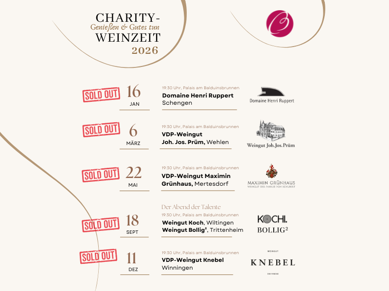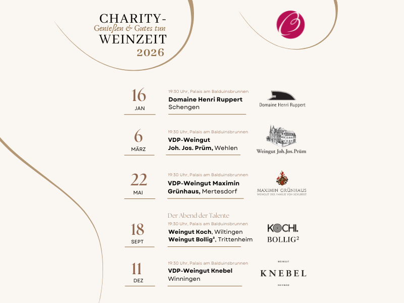 2026 geht die beliebte Charity-Reihe „WEINZEIT“ in eine neue Saison und wir sind voller Freude, die wundervollen Weingüter, die daran teilnehmen werden, vorzustellen. Erleben Sie unvergessliche Abende, die den Genuss erstklassiger Weine mit einem guten Zweck vereinen. Freuen Sie sich auf exquisite Weine, anregende Gespräche und ein inspirierendes Miteinander.
