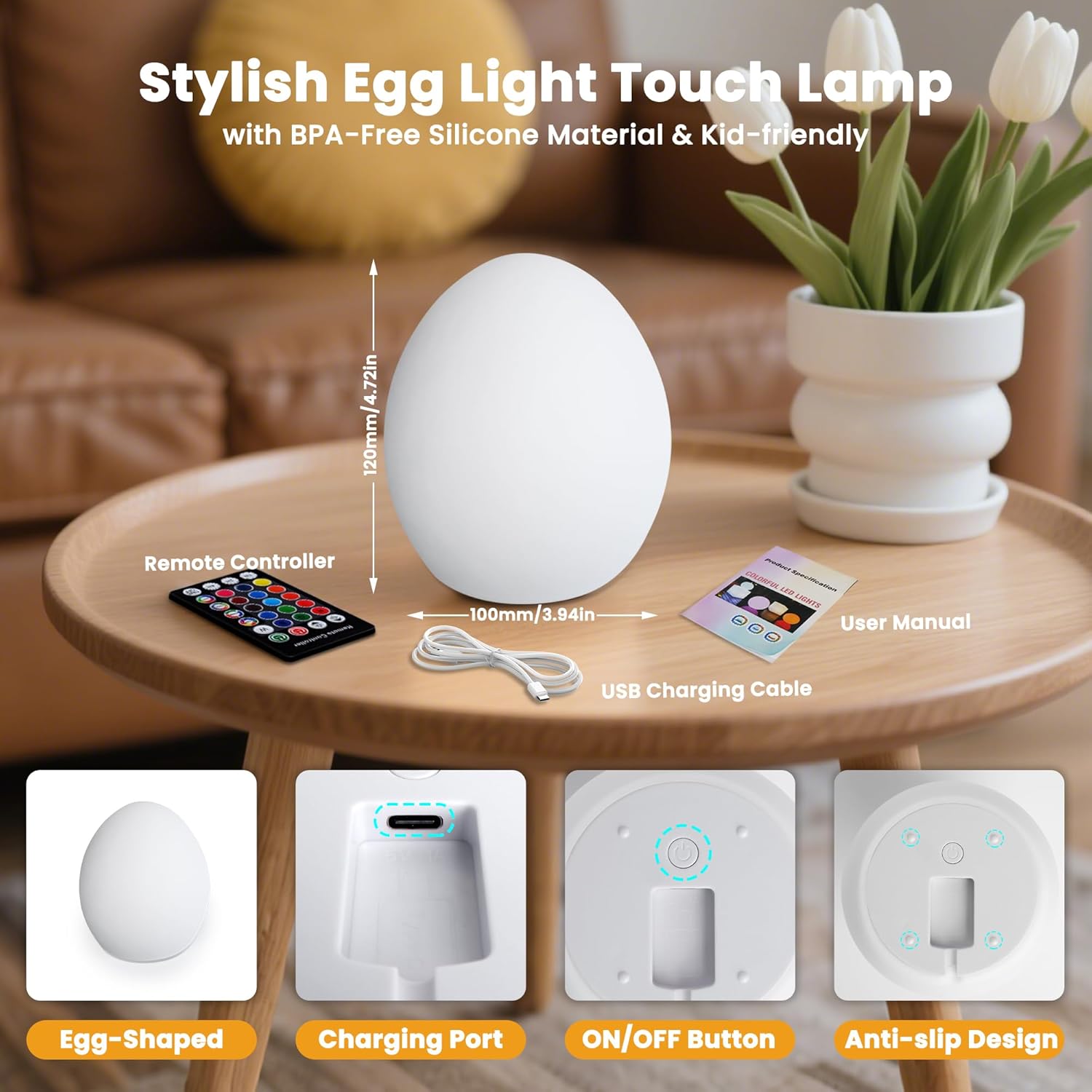 | Subject Character | night light, egg light for nursery, baby night light, egg light, night light for baby nursery, rechargeable night light, dimmable night light, nursery night light, egg nightlight for baby nursery, touch night light, portable night light, silicone night light, color-changing night light |