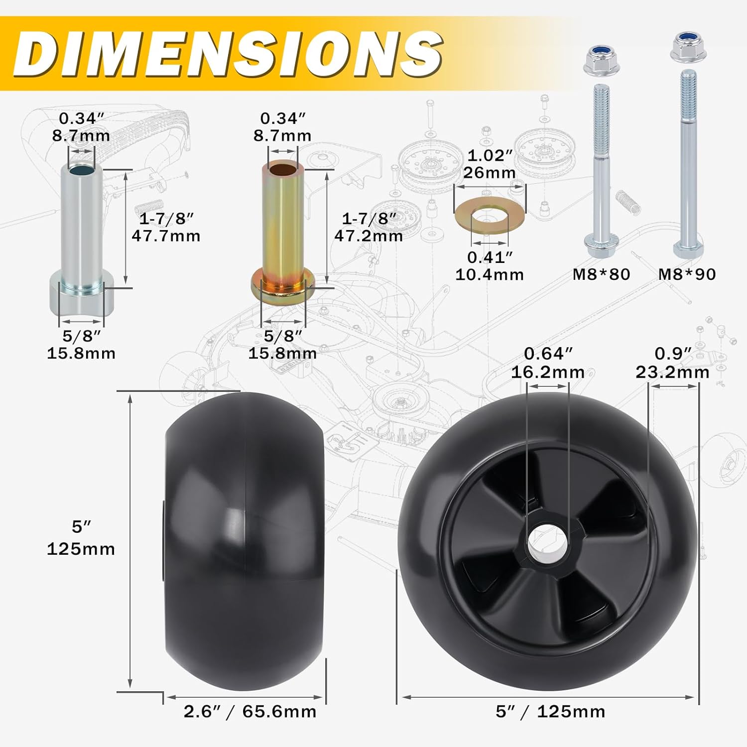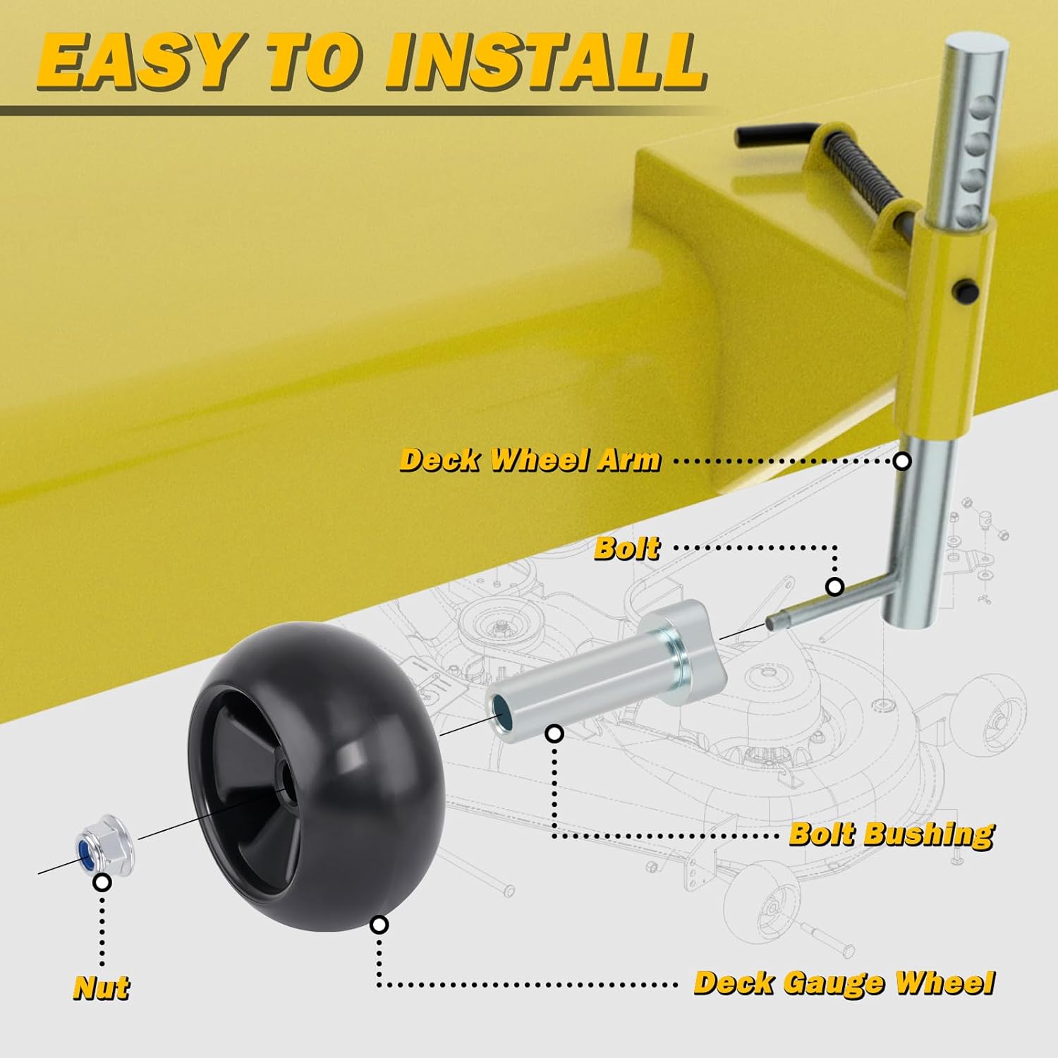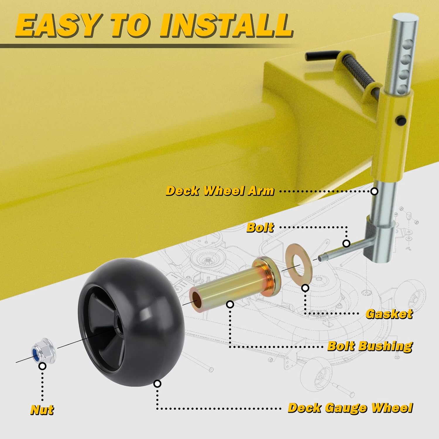| Included Components | 4 pcs gaskets, 4 pcs mower deck wheels, 8 pcs bolts & lock nuts, 8 pcs mental bushings |