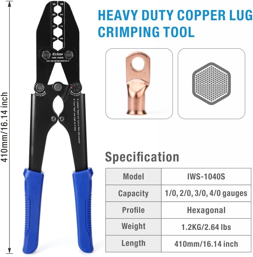 Ergonomically improved handle shape with comfortable slip guard. Particularly confident grip thanks to slip-proof soft components. Thumb recess and "finger hook" at the end of the handle ensure a good transmission of force when the blade is pulled. Supplied with protective cap for safe storage. Insulating multi-component handles. Lanyard hole for working at height. ICP-211 has double edged blade to cut on the push and pull stroke. This heavy duty mechanical crimp tool is more cost-effective than battery tool and safer than hydraulic tool. Middle-sized tool has big crimping capability. Easy storage tool is suitable for both indoor and outdoor operations. Loose parts free heavy duty crimp tool. Low MRO rate mechanical crimp tool. Crimps AWG 1/0 through AWG 4/0 cable lugs as easy as hydraulic tools. The compact design allows for easy storage and handling. Designed for 1/0 gauge to 4/0 gauge die cast copper battery terminals and copper lugs.